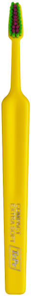 A TePe népszerű fogkeféje kis háromszög alakú fejjel, lapos nyéllel és egyenes vágású, extra lágy sörtékkel. TePe Colour Compact x-soft, fogkefe, sárga