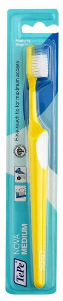 A TePe Nova fogkefe nem csak a megszokott magas minőségű sörtékből épül fel, hanem afej elkeskenyedő végén egy plusz hosszabb szálakból álló sörtecsomó is helyet kapott. A speciális, hosszított sörtecsomó segítségével a nehezen elérhető helyek is könnyen hozzáférhetővé válnak, főleg a hátsó rágófogak területénél. Ergonomikus, csúszásmentes bevonattal kiegészített nyele segíti a biztos kézben tartás, elkeskenyített feje pedig kényelmessé teszi a használatot még a belső felszíneken is. A lekerekített sörteszálak kíméletesek a fogínyhez és a fogzománcot sem károsítják. Tulajdonságok: - Medium (közepesen kemény): kék sörtevég – alapos plakk eltávolítást garantál - Egyenesre vágott sörték, a végén hosszabb szálakkal - A fogkefe fejének dőlése nagyszerűen alkalmazkodik a tisztításhoz - Elegendő a kefét forró vízben felmelegíteni és ezt követően a nyakát a kívánt helyzetbe hajlítani A színválasztásra vonatkozó kérések teljesítését nem tudjuk garantálni. Megértését köszönjük!